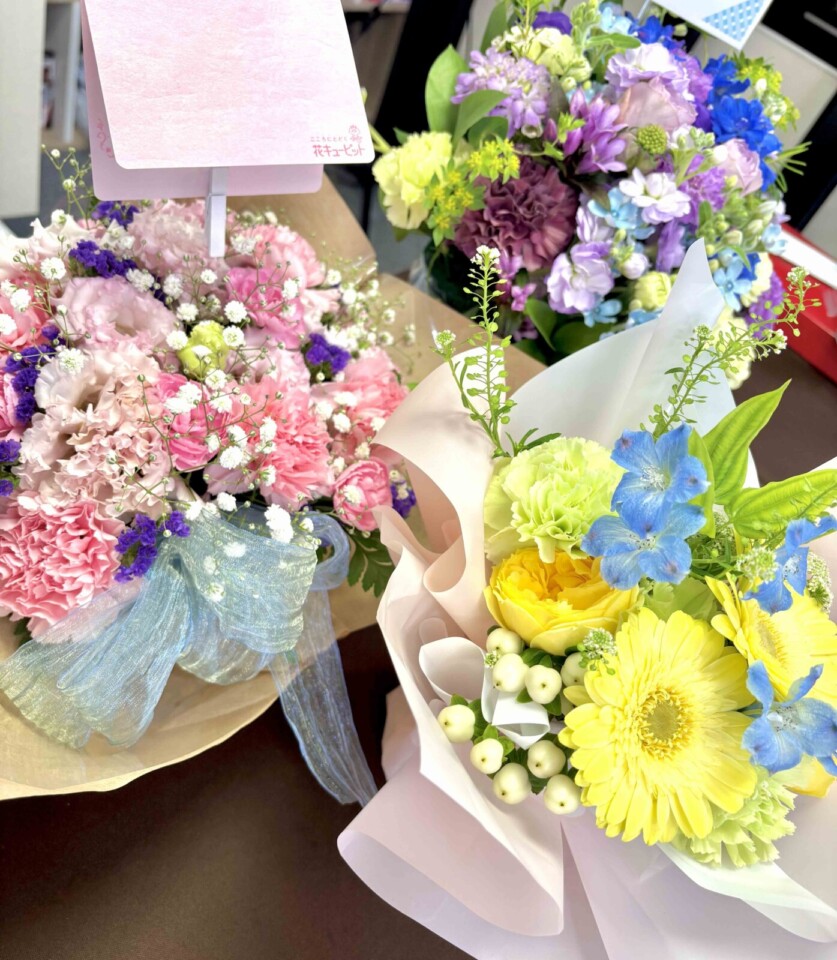たまたまだとは思いますが、ピンク、青、黄色とそれぞれ違ったの色合いの花束でとっても華やかで素敵でした😍