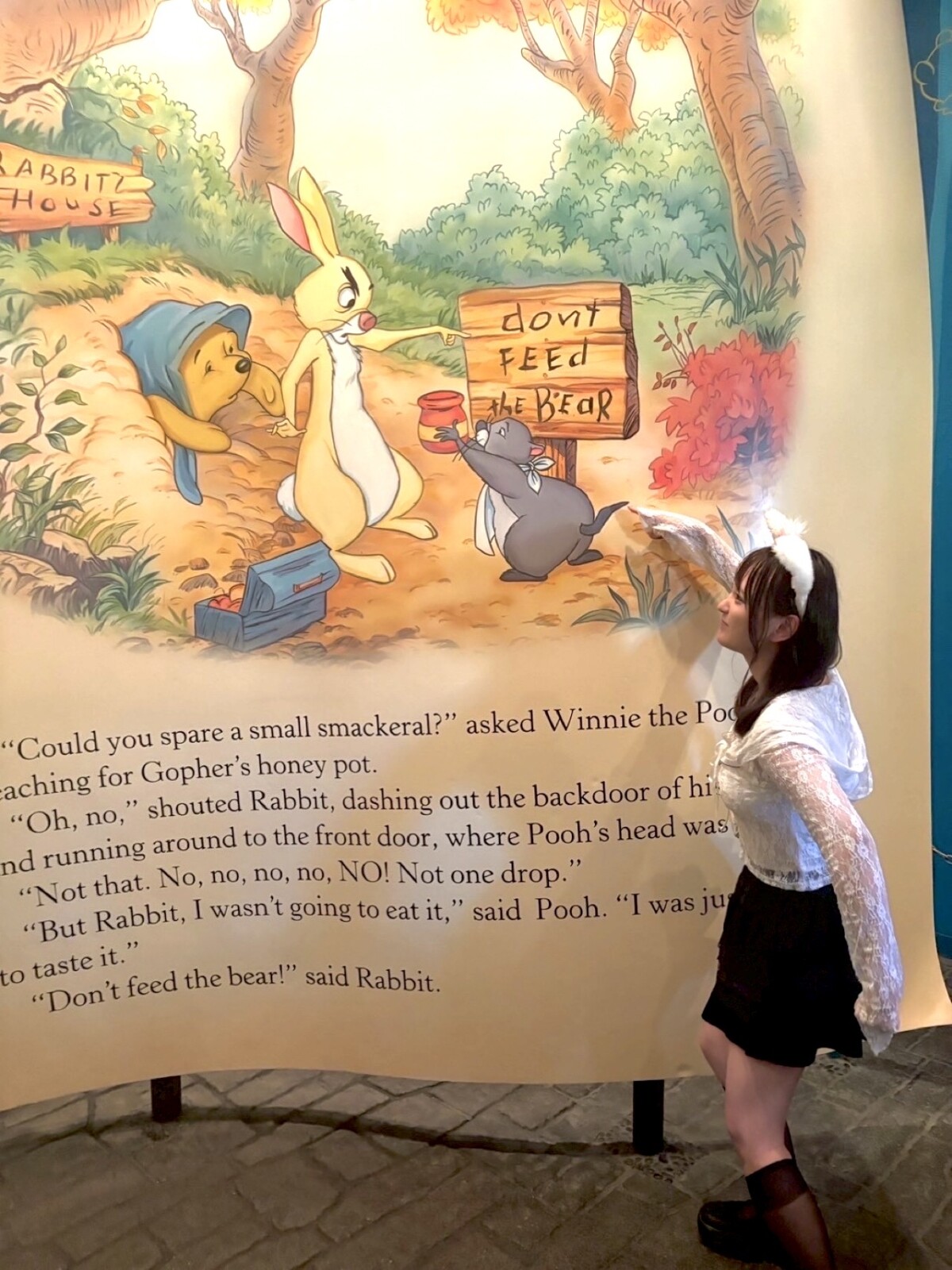 この写真は、プーさんのハニーハントに並んでる時の写真🍯ラビットの真似をしてるのですが似てますか?