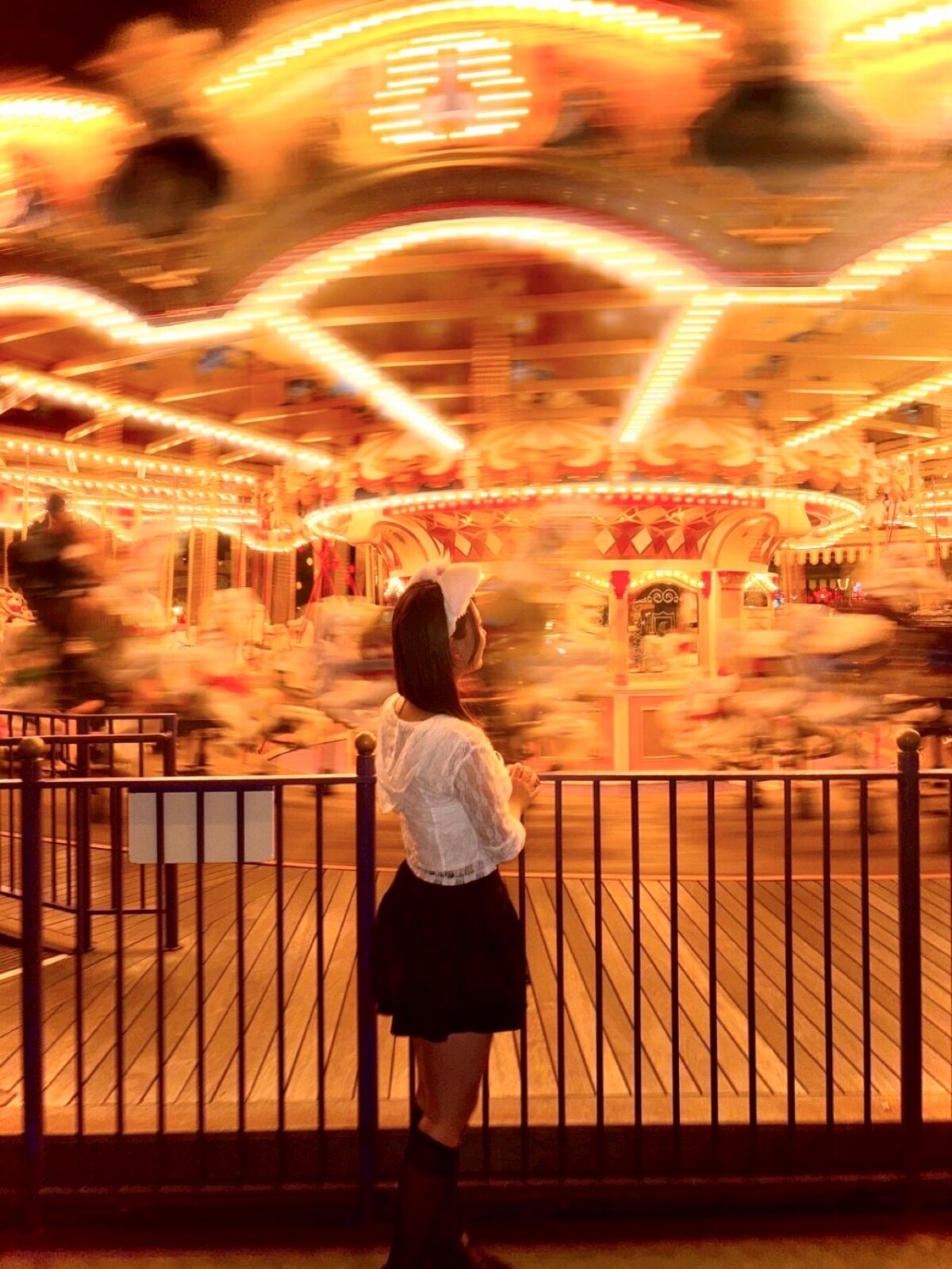 友達に手を引かれ、連れてこられたのはメリーゴーランド前🎠ここが夜になってからの人気撮影スポットです!