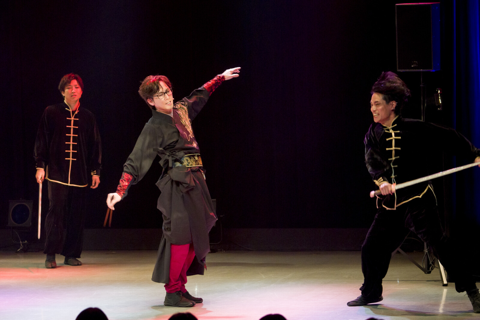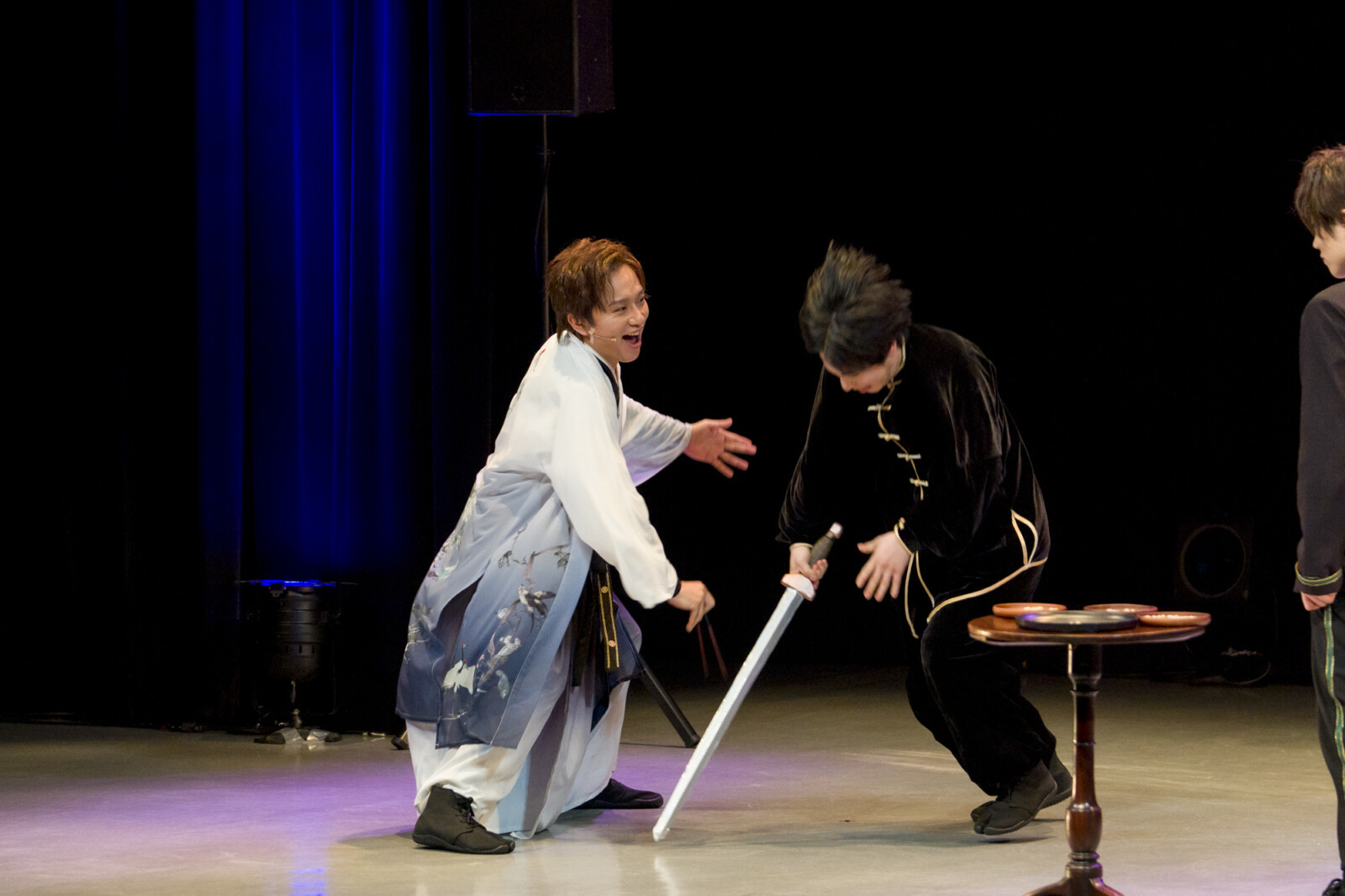 オープニングはキャスト陣がいきなり殺陣を披露。ステージだけでなく、客席でもパフォーマンスが行なわれ、オーディエンスからは拍手が起こっていた。