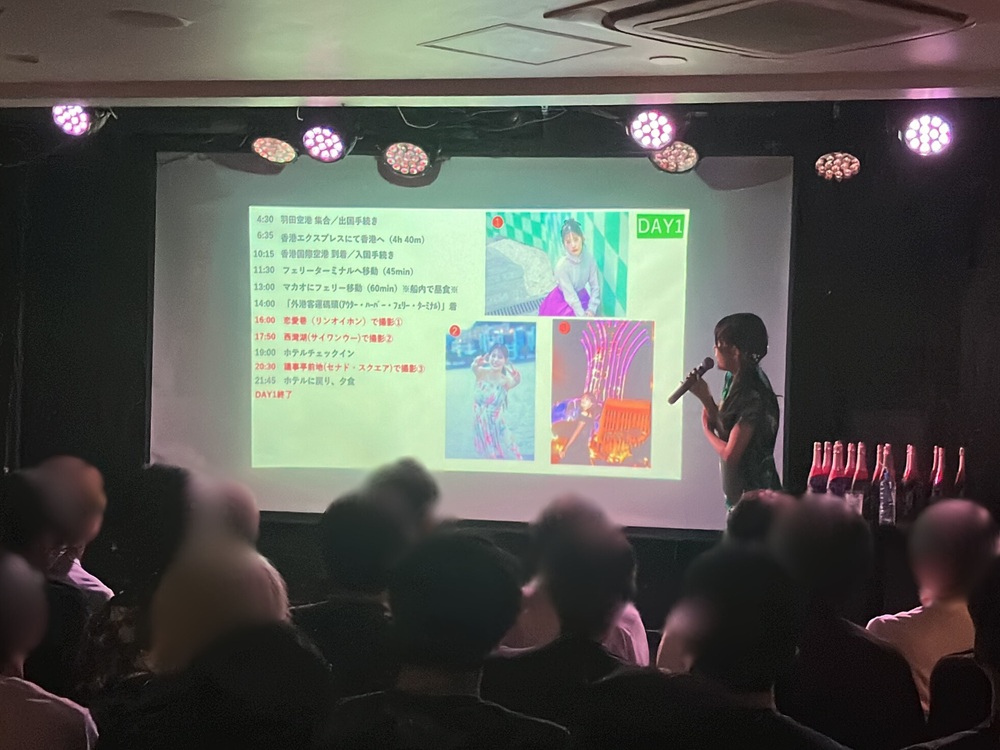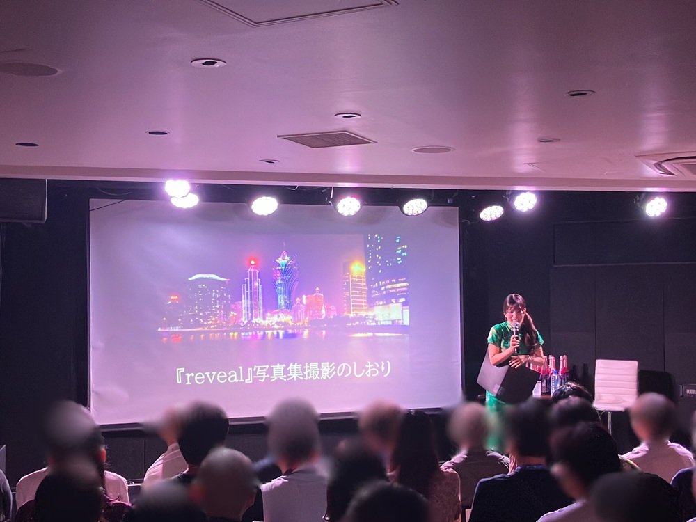 最初のコーナーでは、2泊3日で行われた写真集『reveal』のマカオロケを振り返り。田中さんは空港に早朝4時半集合という過酷なスケジュールを語り、香港経由でフェリー移動中にメイクを済ませたというエピソードを披露。特にフェリーターミナルのチケットカウンター付近で簡易的なメイクスペースを設け、公開メイクを敢行したという裏話には、会場から驚きの声が上がった。