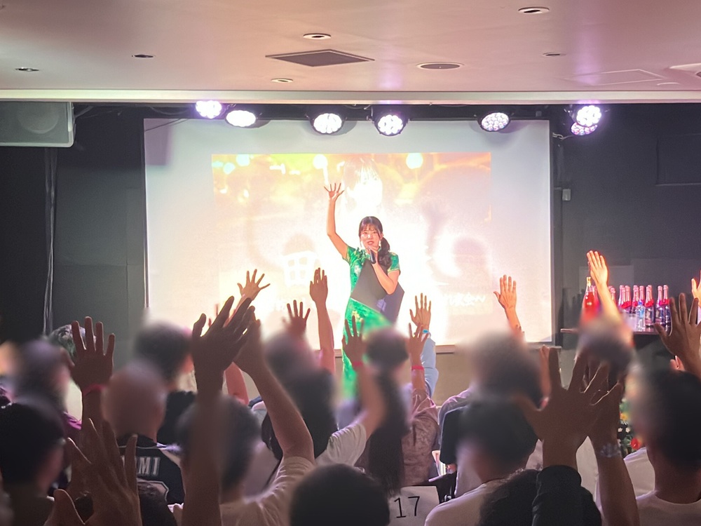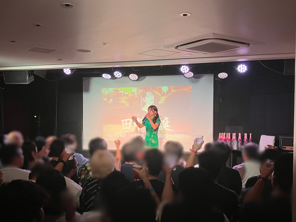 トークコーナーが終わると、誕生日のご褒美をかけた「田中爆誕プレゼントチャレンジ」のコーナーへ。「田中ちえ美の質問逆サバイバルチャレンジ」と題された挑戦は、田中さんが出す「Yes/No」形式の質問に対し、「No」の回答を持つ人が手を下ろしていき、最終的に目標人数が残ればクリアというルール。チャレンジ成功のプレゼントは、第一部と第二部のおつまみ(ジャーキー、マグロチーズ)にぴったりだという、「ちえびじん 紅茶梅酒」。