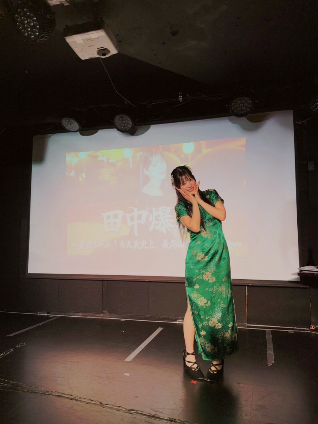 イベント当日、会場に入場するやいなや参加者を迎えるのは、なんと田中さん本人。イベント衣装として写真集でも着用したグリーンのチャイナドレスに身を包んで登場した。自身の名前にちなんでセレクトした日本酒「ちえびじん」などをお酌しながら、一人一人と話に花を咲かせて出迎えが終わると、「また後で!」と一度舞台袖へはける田中さん。