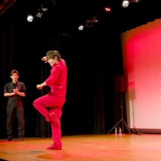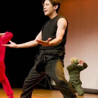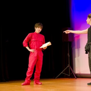 昼の部に続き、前説はアクション講師兼殺陣指導の清典さんが担当。準備が整うと、小松昌平さん書き下ろし脚本によるヒーローショーが開幕した。怪人リーフマンの清典さんに対し、ヒーローとして小松昌平さん(オレシレッド)、濱野大輝さん(フーリガンブラック)、永野由祐さん(お姉さんピンク)が登場。濱野さんは応援戦隊フーリガン出身でコンプライアンス研修を経たという設定で、永野さんは女性言葉を使うお姉さん役を熱演した。即席チームゆえに苦戦したが、観客からの「頑張れ!」という応援で結束し、敵を倒して和解した。