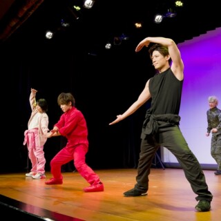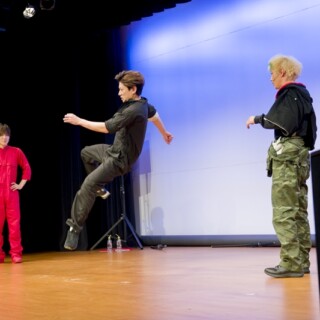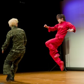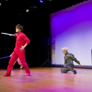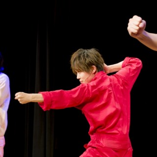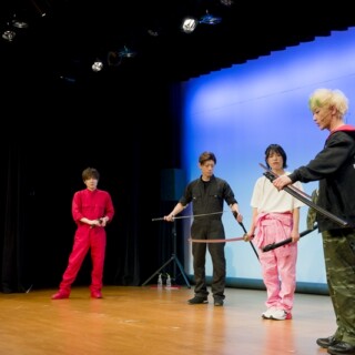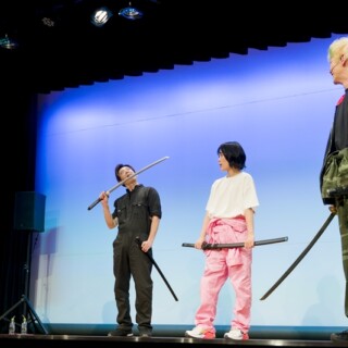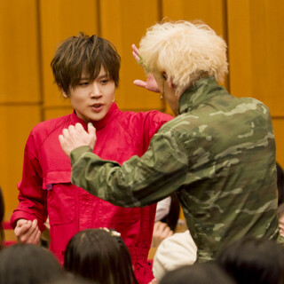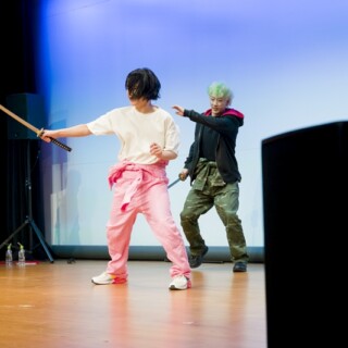 イベント後半は、清典さんを講師に迎えた「殺陣ワークショップ」を実施。 永野さんには、得意のサッカーの動きを例えに使った殺陣が伝授され、ボールをまたぐフェイントの動きで敵をかわし、振り向きざまにヒールでパスを出すイメージで背後の敵を斬るといったアクションを実践した。濱野さんには、本人が希望した蹴り技を指導。旋風脚はジャンプをして回転しながら蹴る高難度な技で、清典さんからは「ボレーシュートのイメージで」とアドバイスを受け、見事な身体能力でこれを体現し、ダイナミックなアクションを披露した。