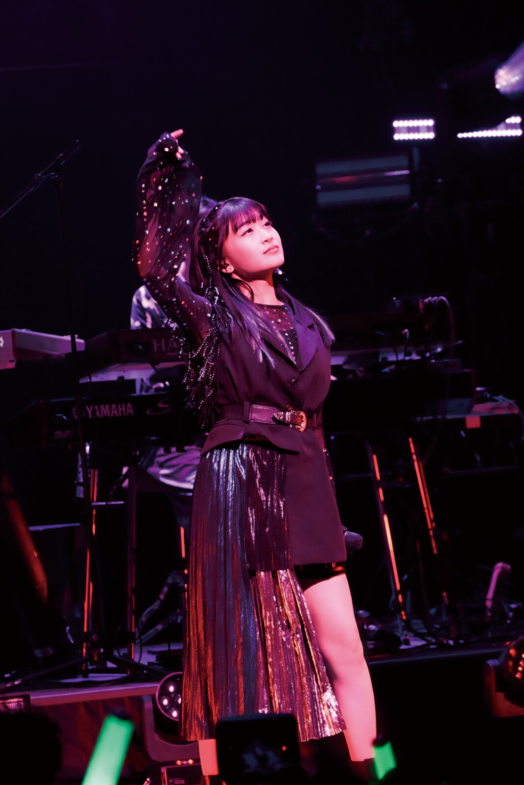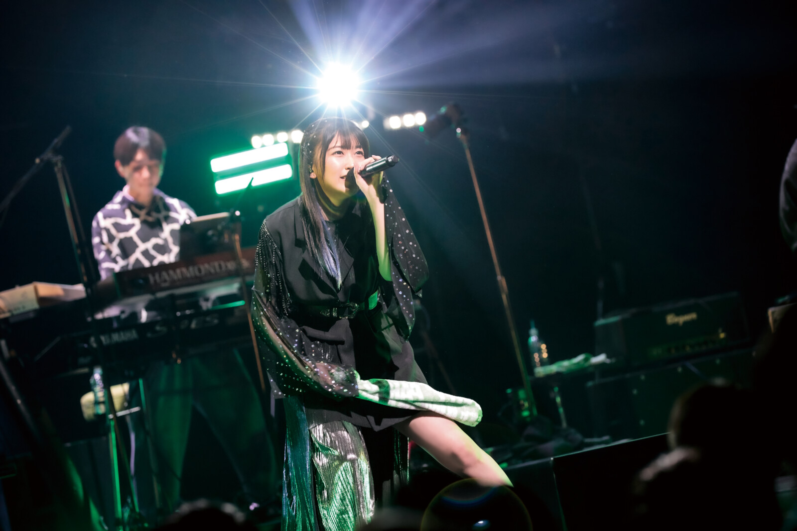 「次の曲はダンス動画が出ているあの曲でございます」と告知すると、クールかつ艶やかなダンスポップ「KURAGET DOWN」へ。グッと大人っぽさを増した歌声、波に揺らめくクラゲのような振り付けでファンを魅了していく。生演奏ならではのイントロが付け足された「MIRROR」では、ミラーボールが煌びやかな光を会場に反射させるなか、バンドの紡ぐメロウなグルーヴに乗りながらシックに歌唱。黒地の衣裳にほどこされたスパンコールの飾りもキラキラと輝いて美しい。