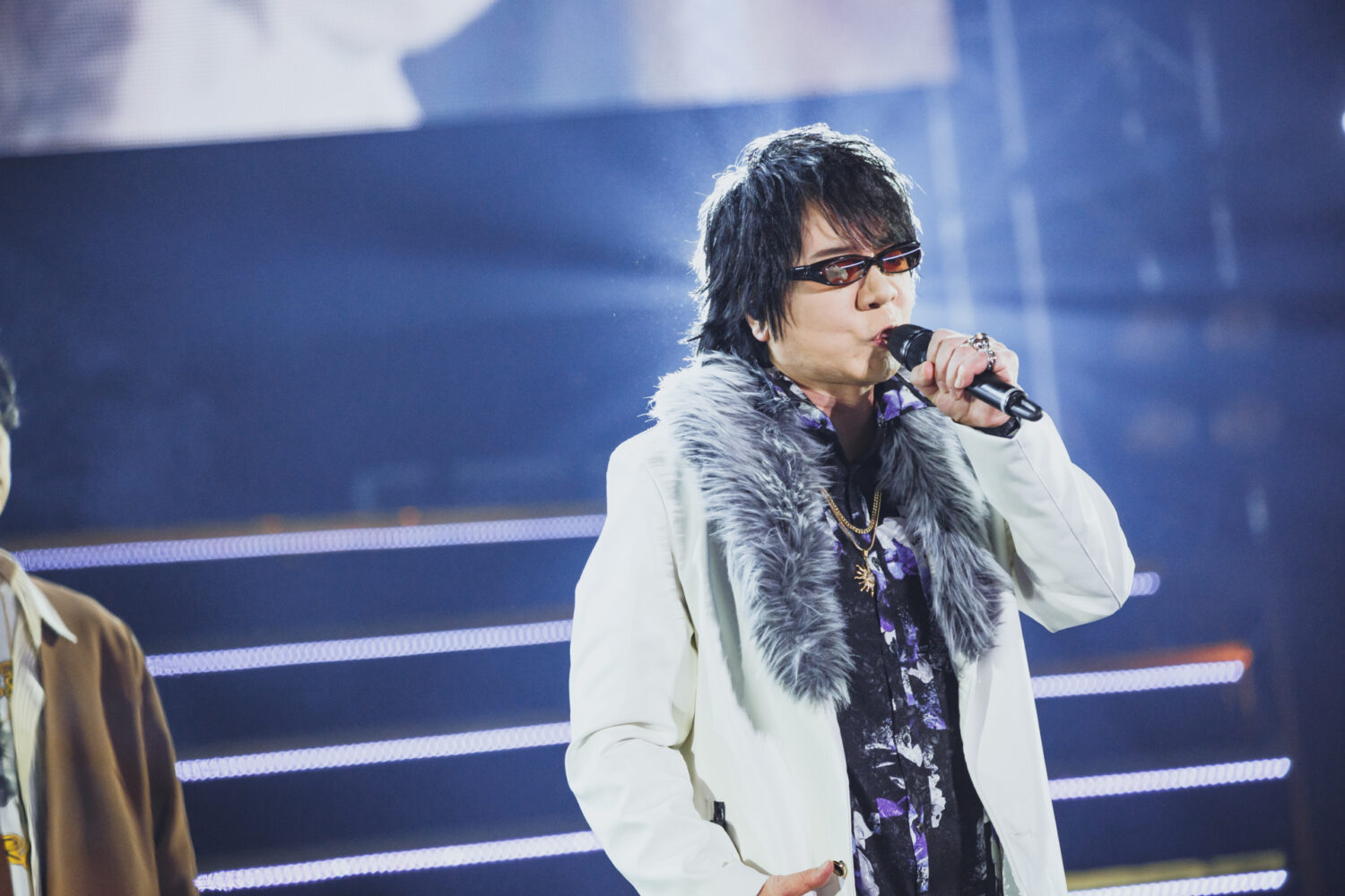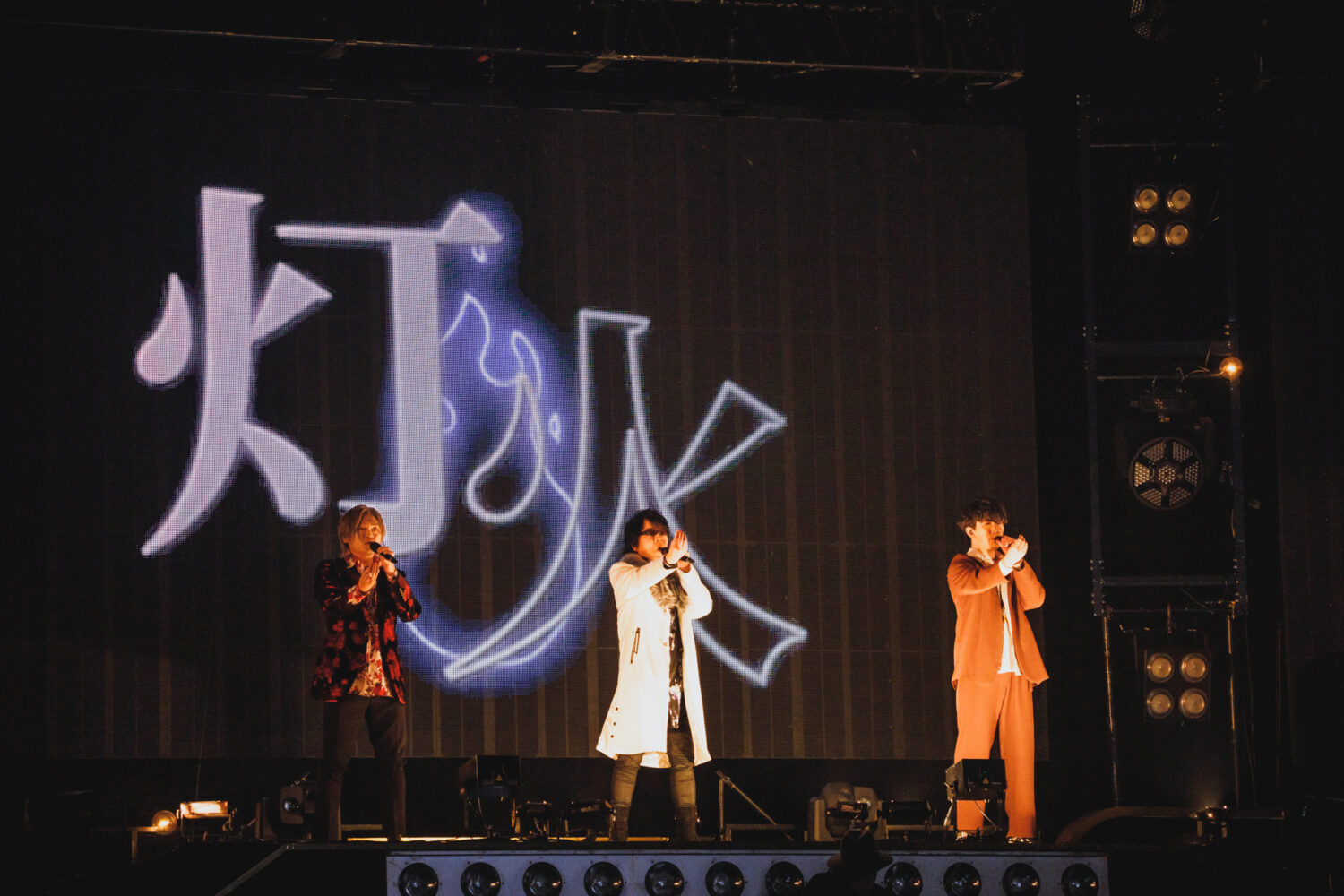 また、ライブの中盤では中王区 言の葉党、東方天乙統女役の小林ゆう、勘解由小路無花果役のたかはし智秋、碧棺合歓役の山本希望の3人がセンターステージに登場。昨年発表となった中王区の楽曲「Femme Fatale」を堂々歌唱。