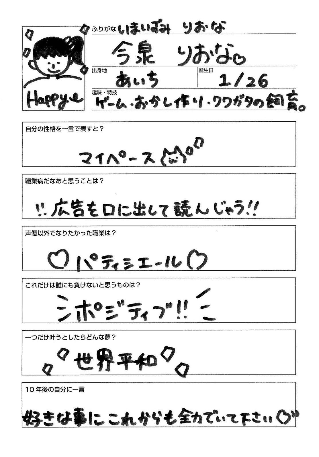 最後まで読んでいただいてありがとうございます。今泉りおなのことを少しでも知ってもらえたらうれしいです。私自身、これからどんどん成長していきたい……というか、成長していくので! その成長過程を楽しんでいただけるように、そしてお芝居でも皆さんを楽しませていけるように、日々精進してまいりたいと思います。これからもよろしくお願いします!