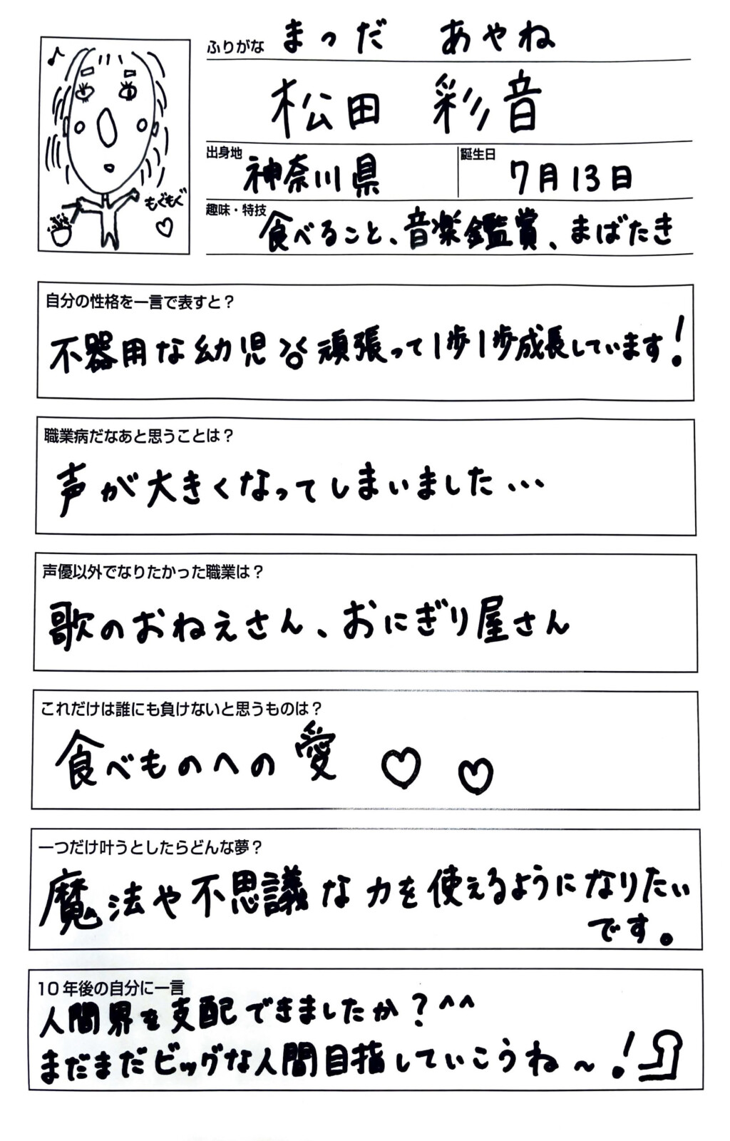 たくさんの作品に主役やメインキャラクターとして出演して、声優やアニメに詳しくない人でも、「声優と言えば松田彩音さん」と言ってもらえるような存在になっていたい!