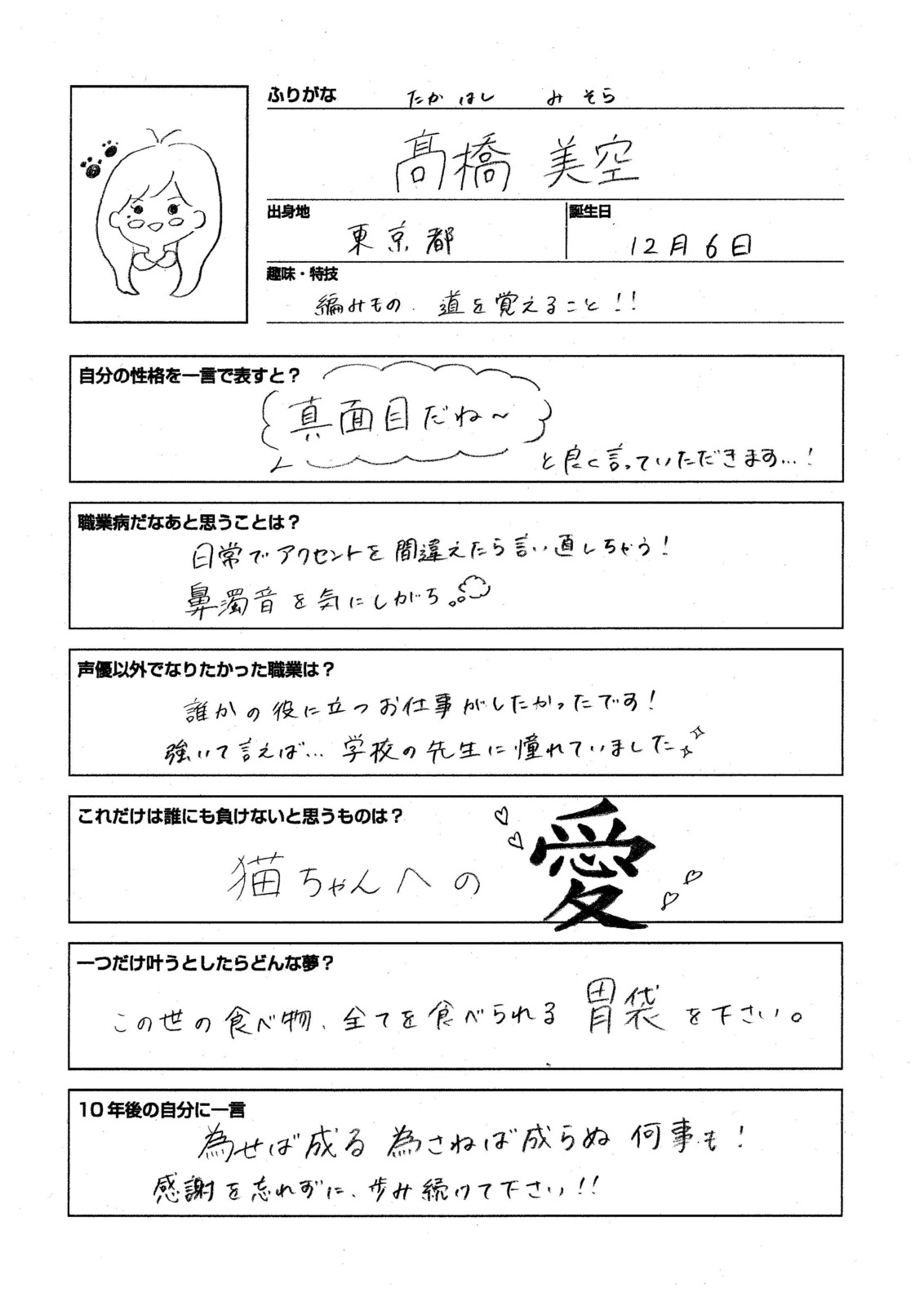 髙橋美空さん手書きプロフィール